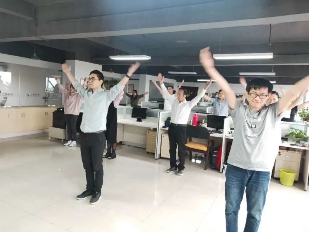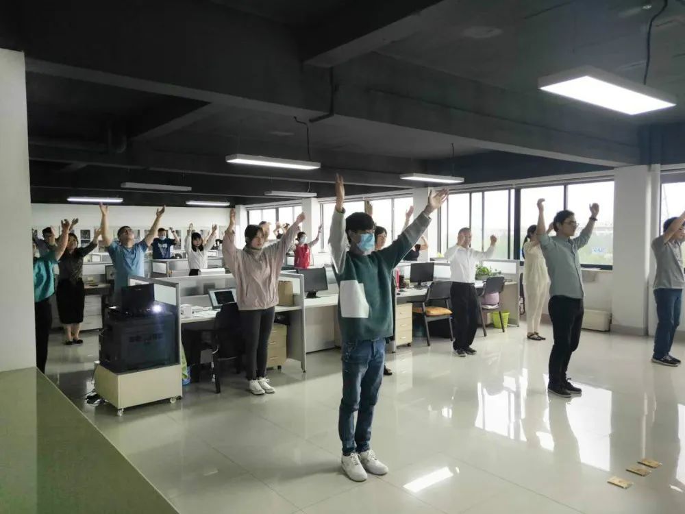 從4月13日起,每個(gè)工作日上午10點(diǎn),在公司大辦公區(qū)域, “第九套廣播體操”悅耳動(dòng)聽的音樂會(huì)準(zhǔn)時(shí)響起,此時(shí),員工們紛紛放下手中的工作,站在自己的座位前,跟著節(jié)拍,在口令的指引下,精神抖擻地做起廣播體操。這是一抹躍動(dòng)的亮色,是一道綻放在疫情肆虐當(dāng)下最具活力的美麗風(fēng)景線,展現(xiàn)了自復(fù)工復(fù)產(chǎn)以來公司良好的企業(yè)形象和積極自信的精神風(fēng)貌。